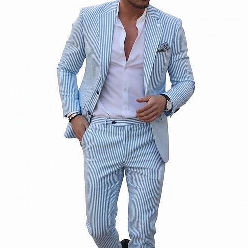 Giacca Seersucker da Spiaggia Casual da Uomo Giacca a Nastro Rosa Celeste Moda Leggera Stripes Fit Su Misura 2 Pezzi Unico Petto Due-bottone