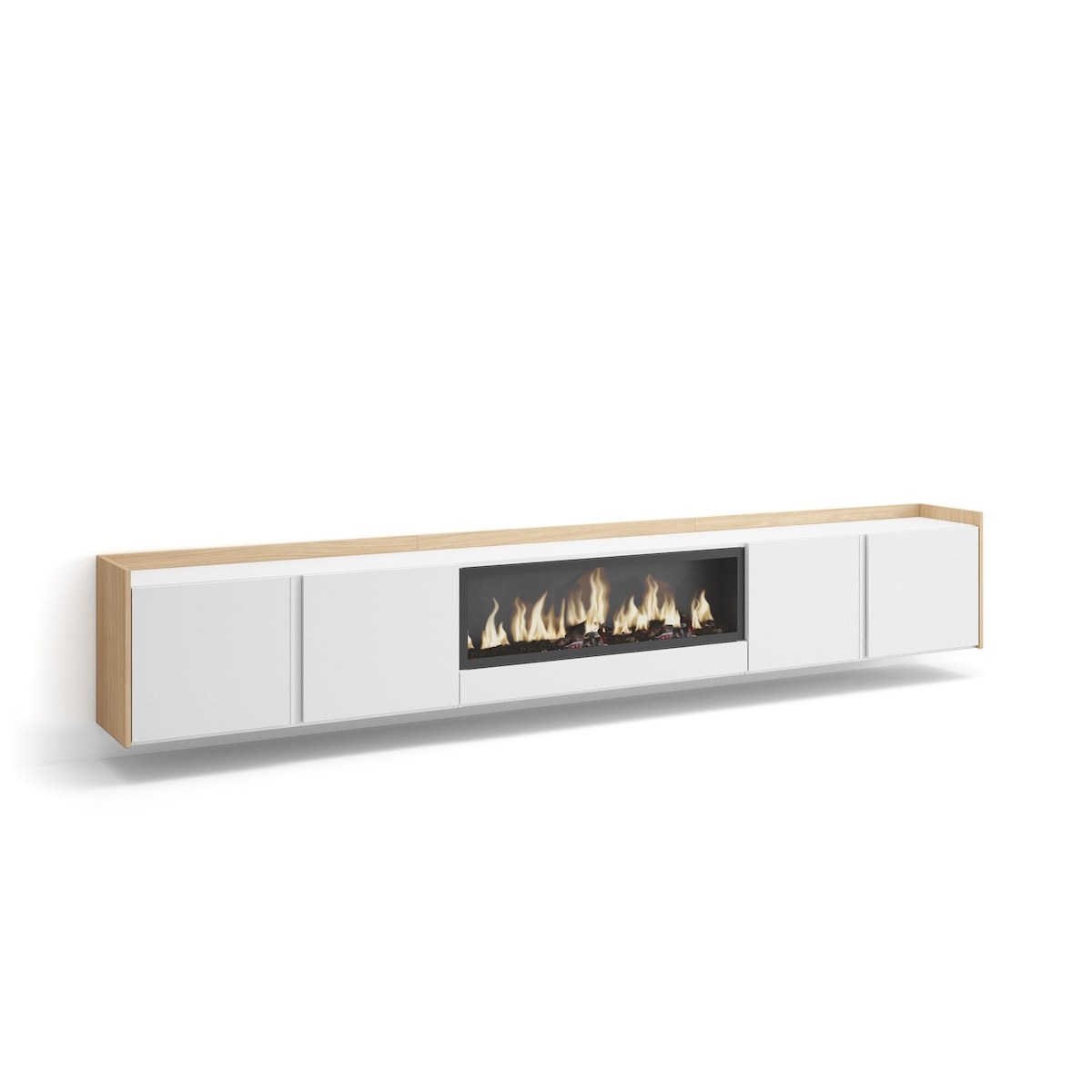 TV-Schrank, Lowboard, 315x50x35 cm, Für TV-Geräte bis zu 80", Elektrokamin XXL, Hängend, Weiß und Eiche Soft