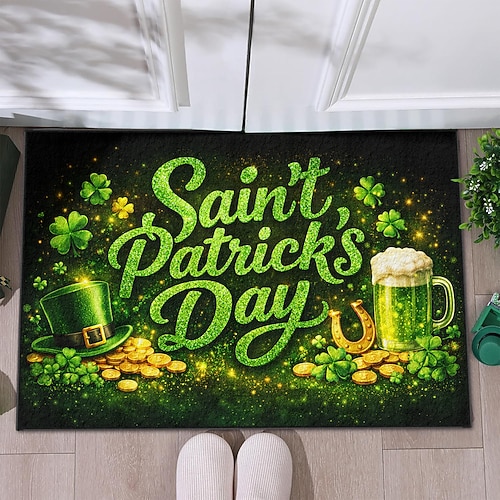 zerbino per il giorno di San Patrizio, design a tema per il giorno di San Patrizio con testo verde glitterato, cappello da leprecauno, boccale di birra e trifogli