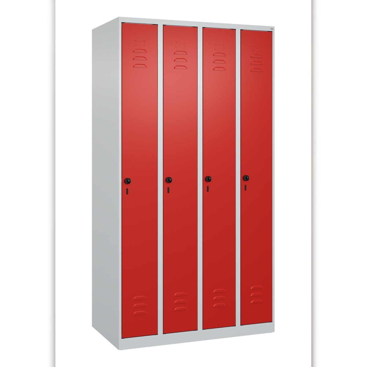 C+P Spind Classic PLUS, 4 Abteile, HxBxT 185x100x50cm, Sicherheitsdrehriegel, Hellgrau/Rot von PROREGAL