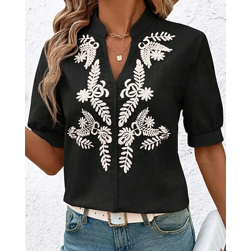 Per donna Camicia Blusa Floreale Elegante Etnico Moderno Manica Corta Scollo a V Top Regolari Quotidiano Ferie Uscire Ricamato Blu Nero Rosa Verde Albicocca Estate Primavera