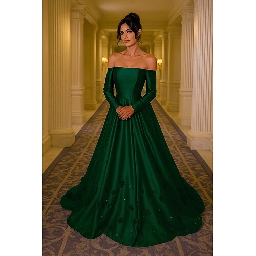 Linea ad A Strascico a Terra Abito da Sera Elegante Setoso Manica Lunga Senza Spalle Matrimonio Formale Tasca Raso con Cristalli