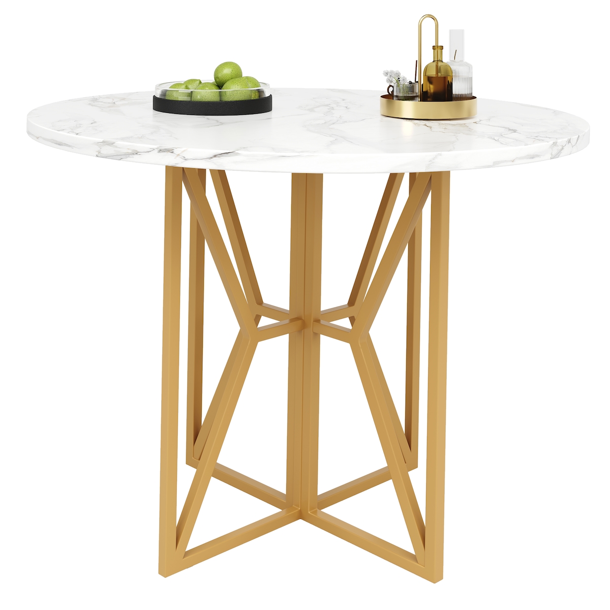 OKWISH Esstisch rund Weiß+Gold 100x100x76 cm mit marmorierter MDF Tischplatte und Metallbeinen, verstellbare Stellfüße, pflegeleicht und stabil