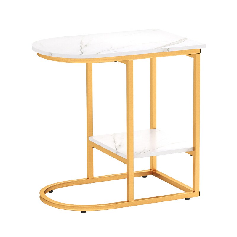 COSTWAY Beistelltisch in Marmoroptik, 2-stufiger Sofatisch mit Ablage, Couchtisch in C-Form, weiß + gold