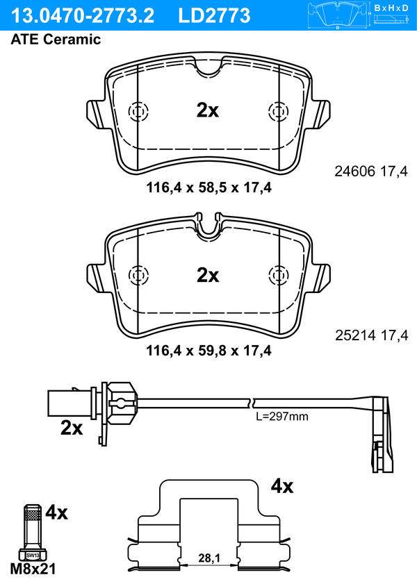 ATE Bremsbelagsatz, Scheibenbremse Ceramic 13.0470-2773.2 hinten rechts links mit Zubehör für VAG 4H0698451A 4H0698451D 4H0698451C