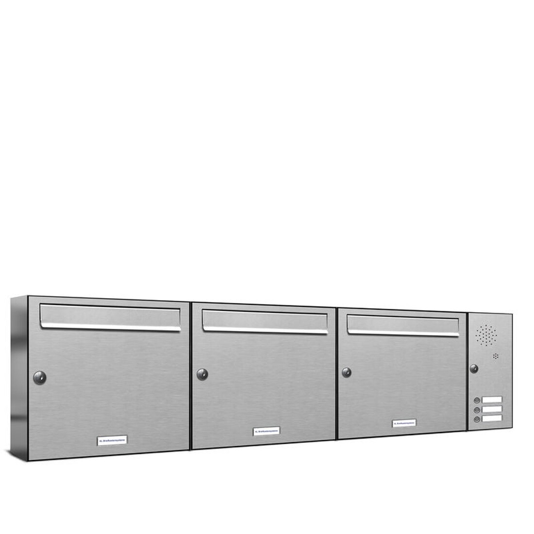 AL Briefkastensysteme 3 Fächer Premium Edelstahl Wand Briefkasten Anlage mit Klingeln, Post A4, modern, robust, wetterfest, Artikelnummer: 331V3EA3KSR