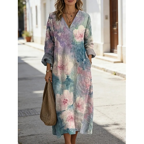 Per donna Abito Lungo Maxi Abito Vestito Casual Abito Floreale Elegante Moda Moderno Quotidiano All'aperto Spiaggia Vestibilità comoda Floreale Grafico Manica Lunga Scollo a V Blu Rosa brillante Rosa