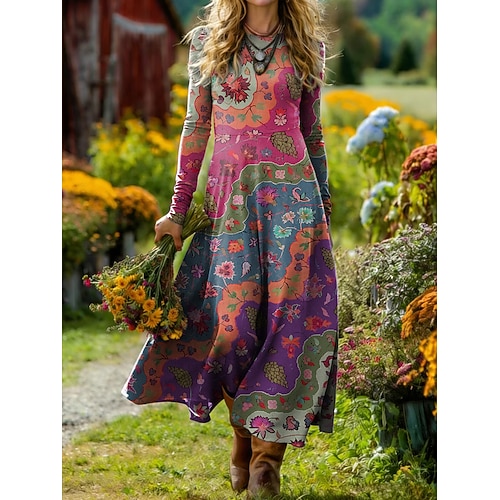 Per donna Abito al ginocchio Vestito T-Shirt Abito a trapezio Casual Vestibilità regolare Grafico Boho Paisley Damasco Manica Lunga Girocollo Scollo Tondo Blu Rosa Arancione Verde Primavera Autunno