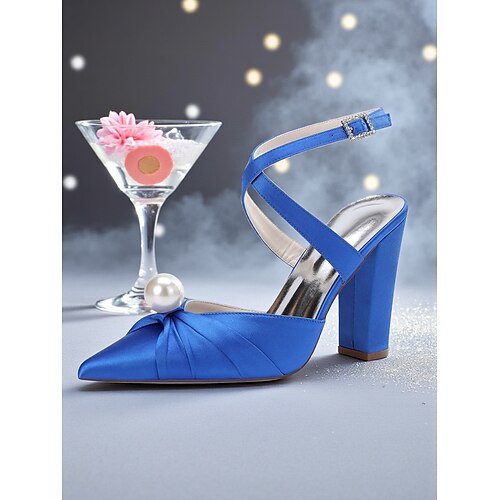 décolleté da donna con tacco a blocco in raso blu, dettagli in perle e cinturino alla caviglia - eleganti scarpe a punta per occasioni formali e cocktail party