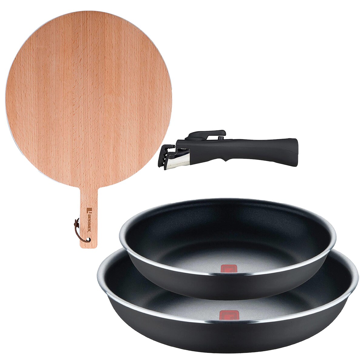 BERGNER - Set mit 2 Bratpfannen Ø24/28cm aus gepresstem Aluminium mit Heat Dot, mit abnehmbarem Griff mit Rundes Schneidebrett 38x28cm aus Buchenholz