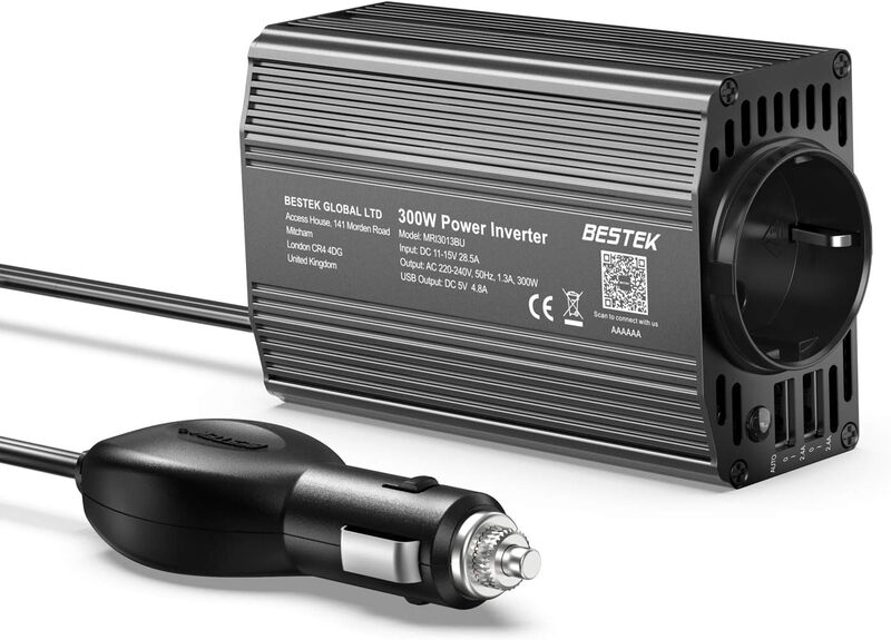 BESTEK Wechselrichter 12V/230V / 300W, 12 zu 230V Wechselrichter, TÜV zertifiziert, 2 USB Ports inkl. Kfz-Stecker, Schwarz