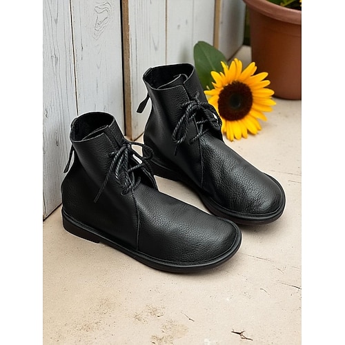 stivaletti alla caviglia stringati in vera pelle color caffè da donna, stivaletti bassi casual vintage con punta tonda, comodi per l'autunno scarpe invernali da indossare tutti i giorni e per gli