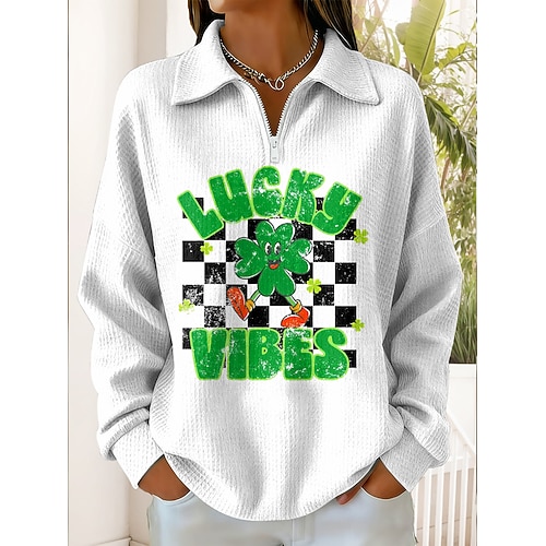Felpa da donna di San Patrizio con grafica Quadrifoglio casual stampa maniche lunghe mezzo zip tops regolari abbigliamento quotidiano sportivo bianca verde scuro verde primavera inverno