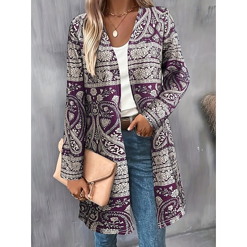 Per donna Cappotto Invernale Trench Leggero Confortevole Stampato Aperturaanteriore Vintage Moda Casual Boho Vintage Geometrico Vacanza Casuale Lungo Senza colletto Vestibilità regolare Manica Lunga