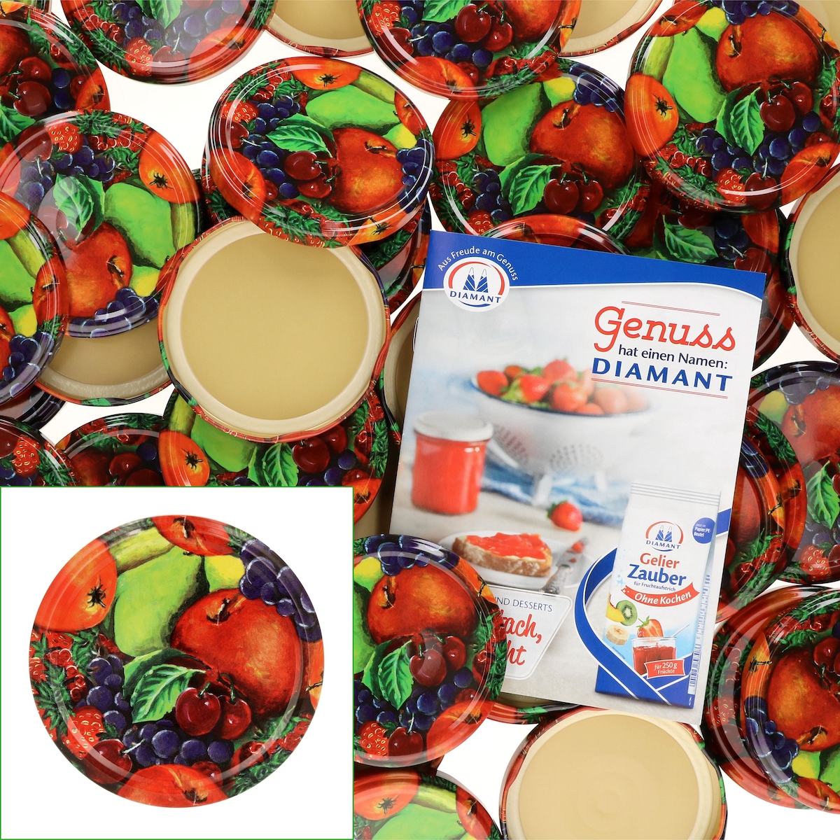 50er Set Deckel To 82 Obst passend für 230ml / 350ml / 435ml Gläser incl. Diamant-Zucker Gelierzauber Rezeptheft