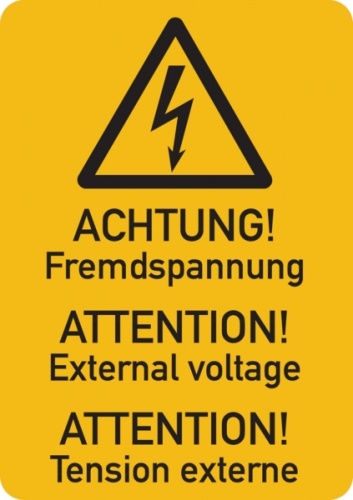 Warnschild, Fremdspannung (3-sprachig), Folie - ISO 7010 - 74x105 mm Folie selbstklebend