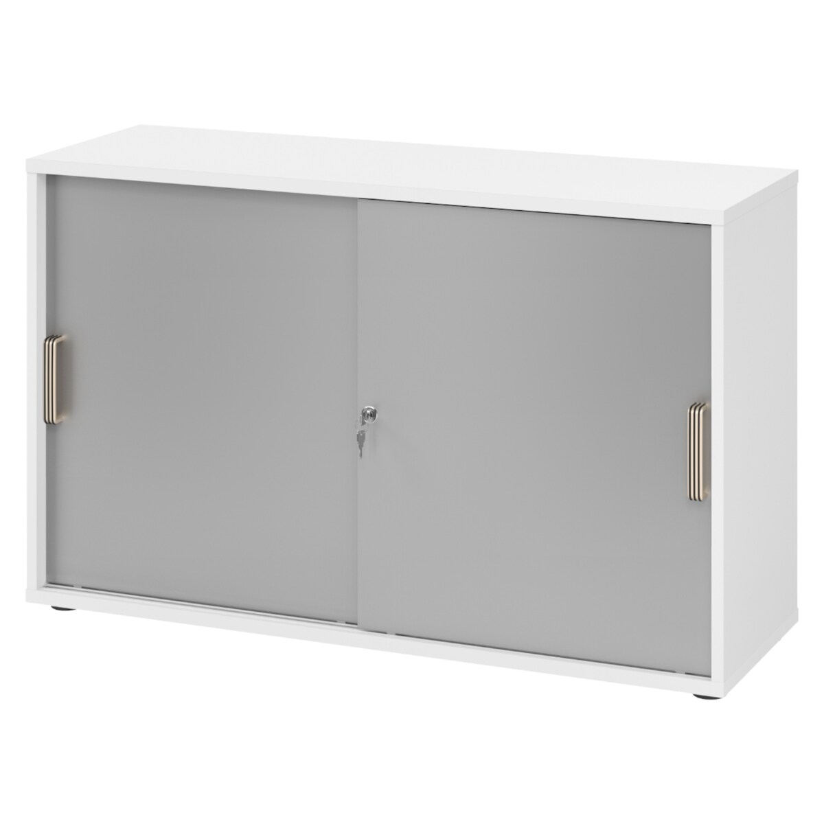 bümö Schiebetürenschrank 2OH - Aktenschrank abschließbar, Sideboard Schrank mit Schiebetüren in Weiß/Silber, Streifengriff - Büroschrank aus Holz mit