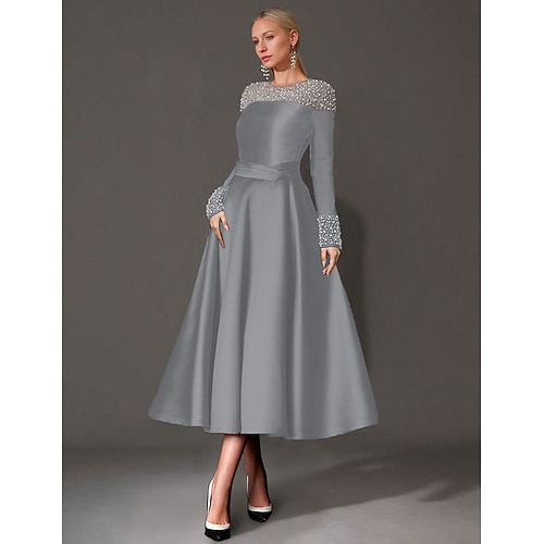 Linea ad A Lunghezza Tè Abiti da Cocktail Elegante Brillanti Manica Lunga Collo gioiello Natale Formale Raso con Perle