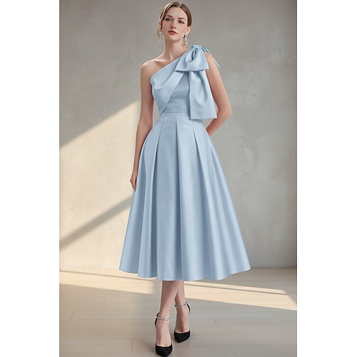 Linea ad A Lunghezza Tè Abiti da Cocktail Elegante Senza Maniche Monospalla Festa in giardino Matrimonio Raso con Fiocco/Fiocchi Pieghe