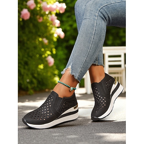 Sneakers da donna con zeppa rosa – scarpe da passeggio traspiranti con inserti intagliati e dettaglio dorato sul tallone per viaggi, lavoro e gite estive