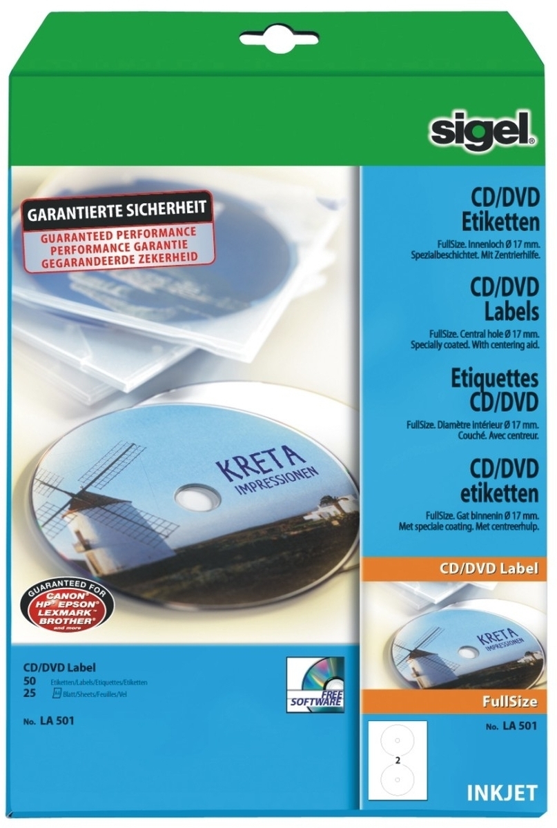 Sigel CD-/DVD-Etiketten Inkjet 117mm VE=10x50 Stück (25 Blatt) weiß