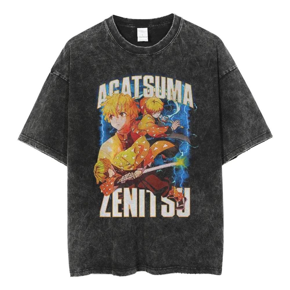 Demon Slayer Agatsuma Zenitsu Tordenpust Vintage Vasket Grafisk T-skjorte, Unisex Oversized Streetwear, Anime Fan Gave cm flerfarget