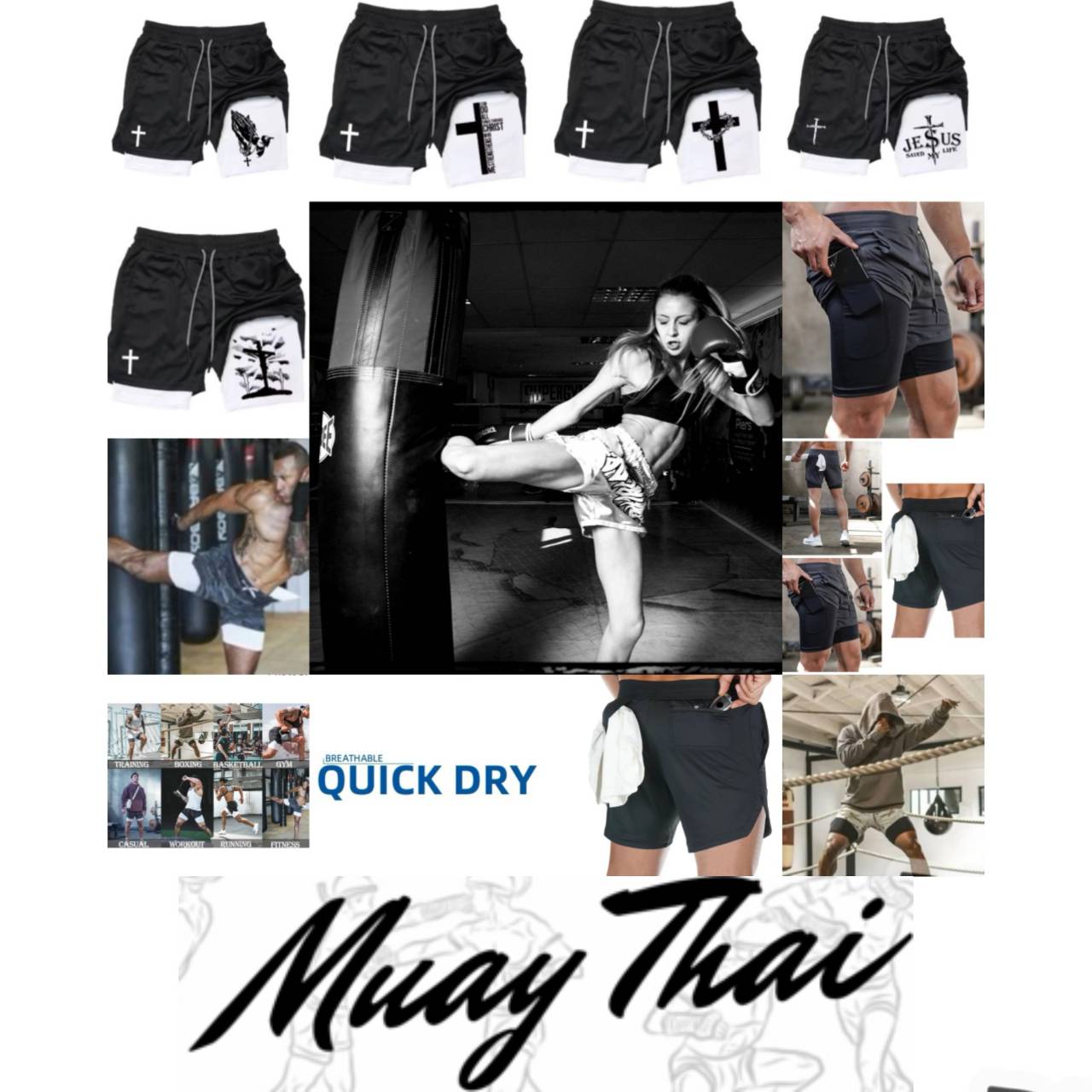Cross Christian God Bible Pray Faith Jesus Muay Thai Kick Boxing MMA Double Layer Shorts Men Women Unisex Quick Dry Training Sport Gym Fitness Workout