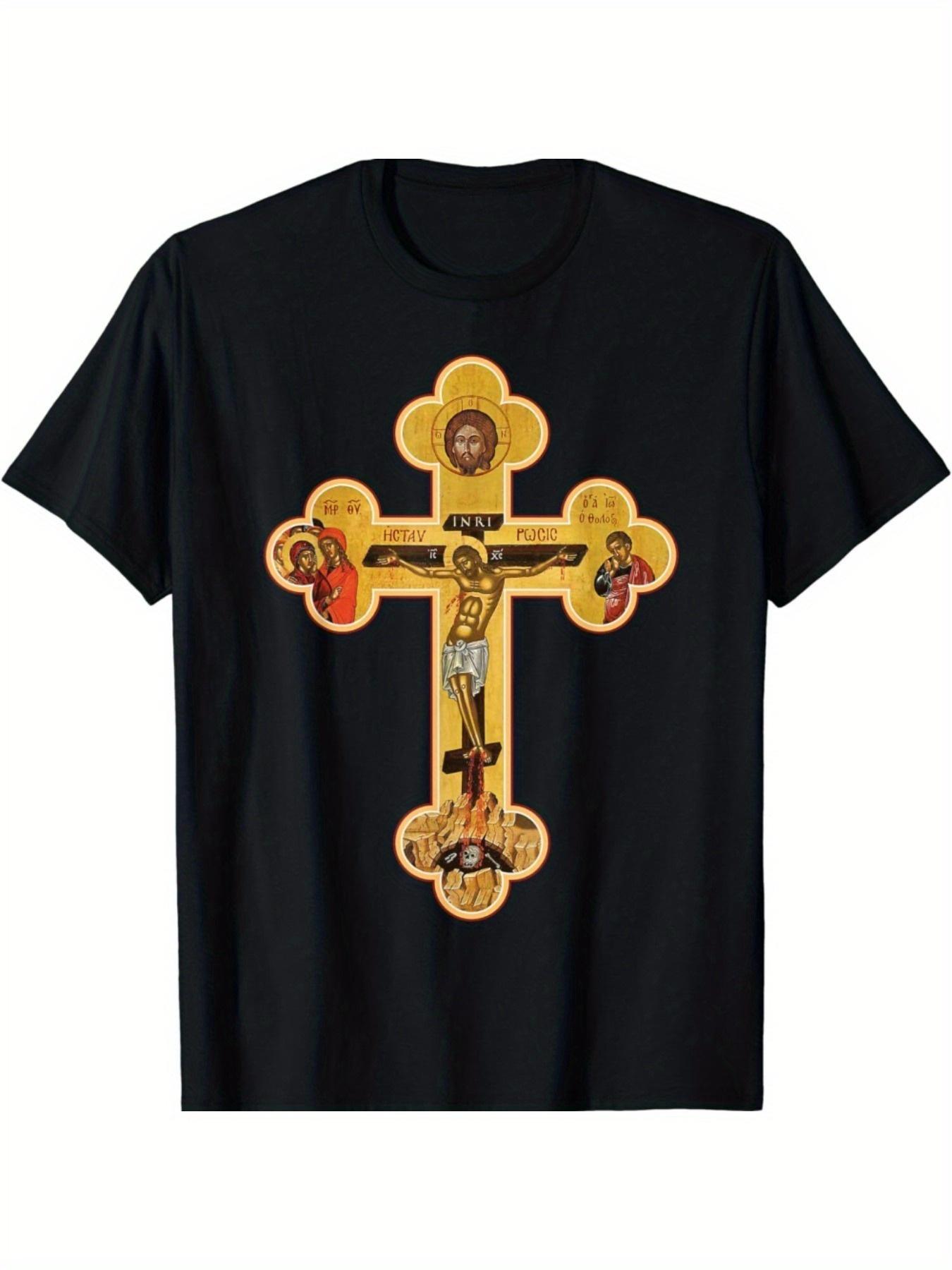 Orthodoxes Jesus Christus Kreuzigung Grafik T-Shirt Schwarz Baumwolle Lockerer Schnitt Kurzarm Christliches T-Shirt für Männer Frauen cm