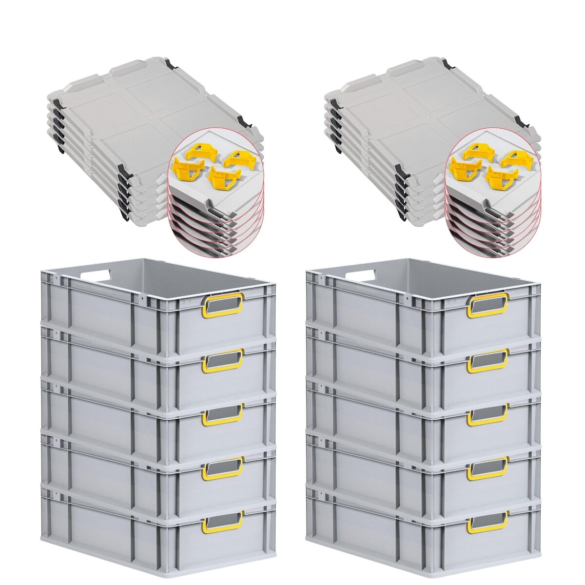 PROREGAL SparSet 10x Eurobox NextGen Color mit Auflagedeckel & Verschlüsse, HxBxT 17x40x60cm, 34L, Grau, Griffe gelb offen, Eurobehälter, Box