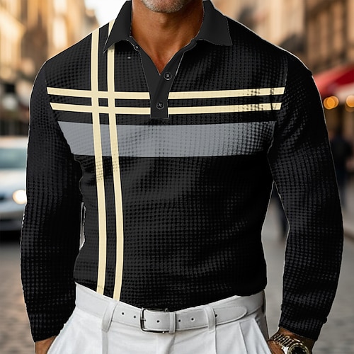 Per uomo Geometrico Strisce orizzontali Magliette Polo a Nido d'Ape Manica Lunga Magliette polo Camicie con Colletto Business Casual Affari Abbigliamento da lavoro Abbigliamento quotidiano Bottoni