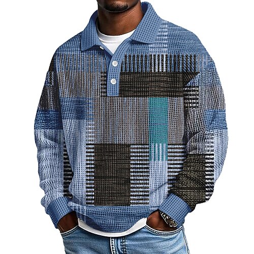 Per uomo Geometrico Blocco di colori Magliette Polo a Nido d'Ape Testurizzato Manica Lunga Magliette polo Bavero Casual Athleisure Abbigliamento quotidiano Stampa 3D Primavera Autunno Inverno Blu