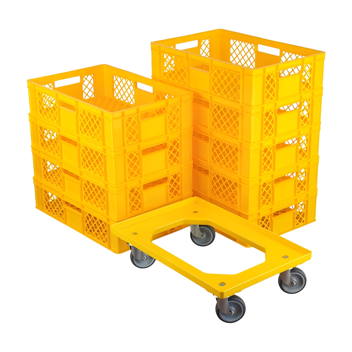 9 Stück Bäckerkisten 600 x 400 x 150 mm + 1 Transportroller Typ C in Gelb