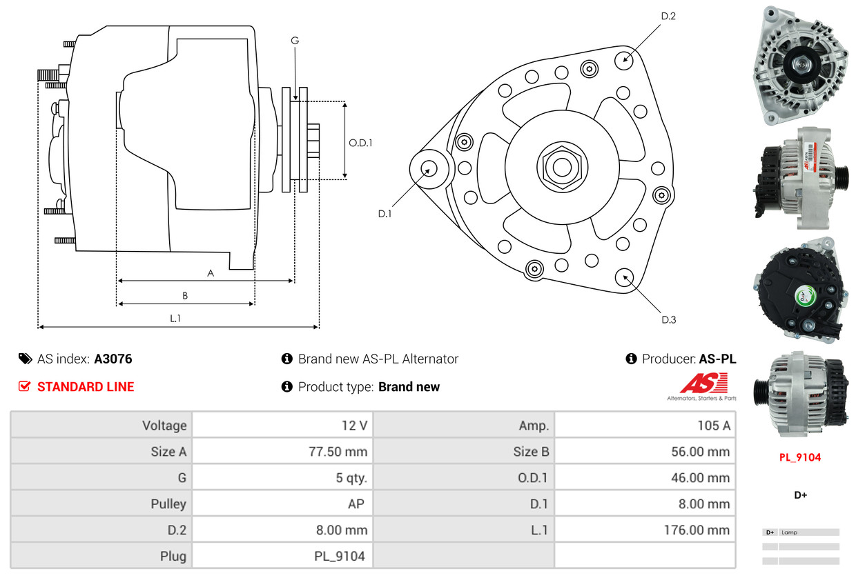 AS-PL Generator A6260PR 12V 105A für VW GENERAL MOTORS FIAT OPEL 71755143 9562207 95520873