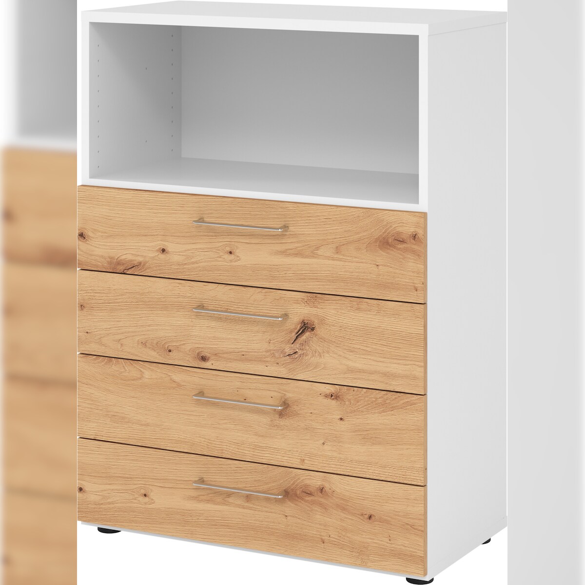 bümö smart Schubladenschrank, Büroschrank 80cm breit in Weiß/Eiche mit 4 Schüben - Bürocontainer aus Holz, Container mit Metallgriffen & Soft-Stop