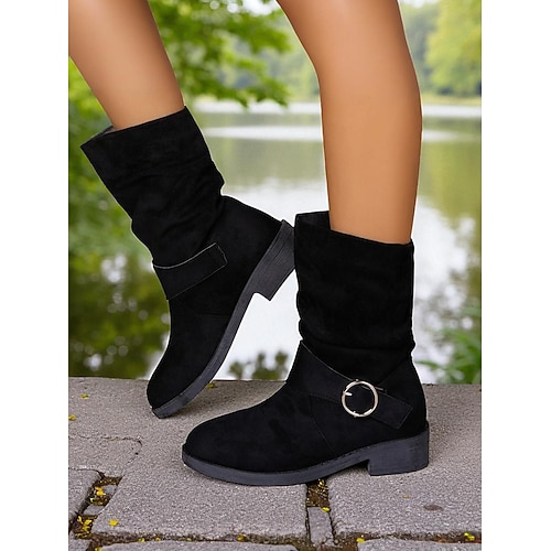 stivali da equitazione casual da donna in finta pelle scamosciata color cachi con design ampio e fibbia ad anello laterale, comodi stivali da equitazione con tacco basso per l'abbigliamento outdoor