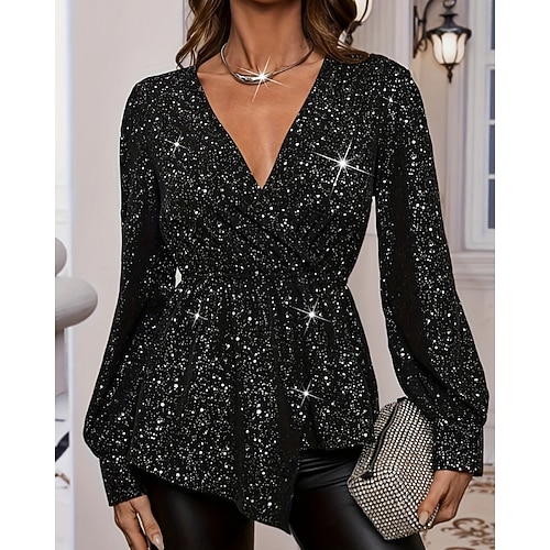 Per donna Camicia Blusa con texture Blusa Semplice Festa Elegante Manica Lunga Colletto a Camicia Top Regolari Festa serale Abiti da festa Paillettes Nero Argento Champagne Verde chiaro Albicocca