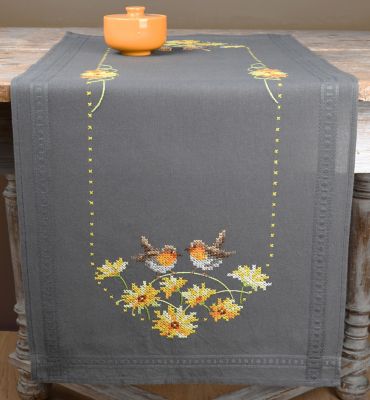 Chemin de table à broder "rouge-gorges et fleurs jaune"