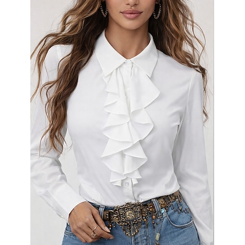 Per donna Camicia elegante Blusa Volant Bottoni Tinta unica Elegante Essenziale Casual Manica Lunga Colletto a Camicia Top Regolari Quotidiano Ufficio Lavoro Bianco Primavera Autunno