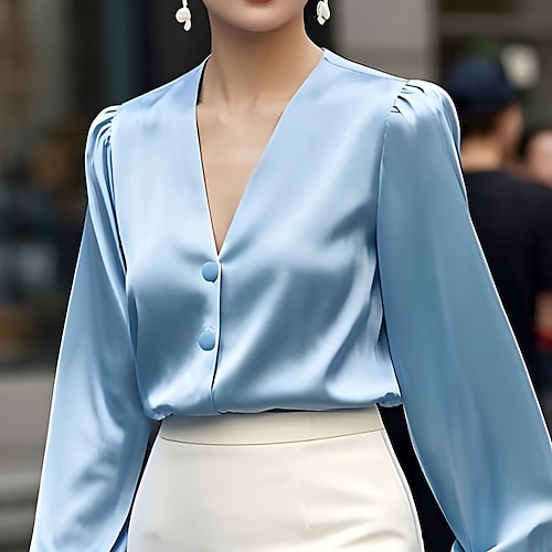 Per donna Camicia elegante Camicia con Bottoni Blusa Bottoni Tinta unica Elegante Affari Manica Lunga Scollo a V Top Regolari Quotidiano Ferie Semi-Formale Blu Estate Primavera Autunno
