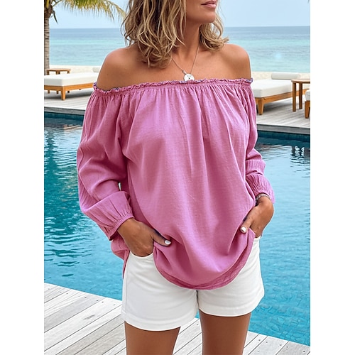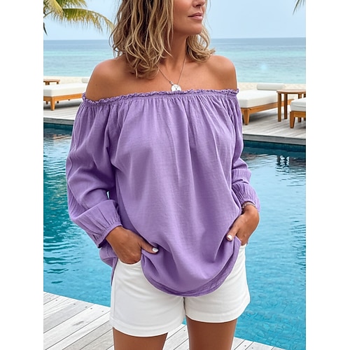 Per donna Camicia Camicie di cotone e lino Camicia di lino Camicia da Spiaggia Volant Semplice Elegante Classico Moderno Manica Lunga Senza Spalle Top Regolari Quotidiano Ferie Abbigliamento mare Blu