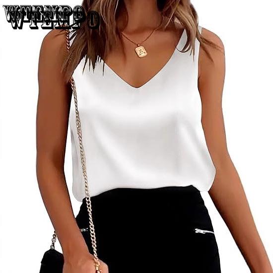 Dam Silkesatin Linnen V-ringad Casual Cami Ärmlös Linneblusar Sommar Basic Linne cm svart