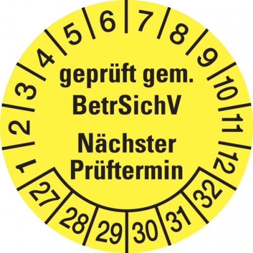 König Werbeanlagen Prüfplakette ab 27, BetrSichV Nächster Prüftermin, gelb/schwarz, Folie, Ø 30 mm - Bogen = 10 Plaketten - 30 mm Folie selbstklebend