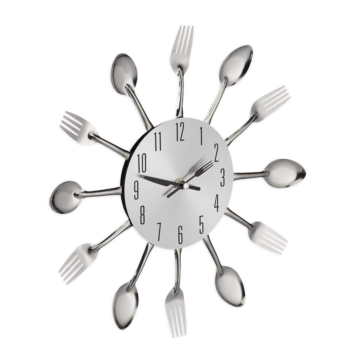 Relaxdays Wanduhr Besteck, Küchenuhr Löffel & Gabel, Ø 31 cm, Metall, batteriebetrieben, ohne Ticken, Besteckuhr, silber