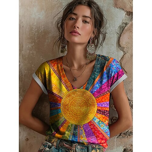 Per donna Maglietta Stampato Grafico Fiori Mandala Bohemien Vintage Casual Manica Corta Scollo a V Top Regolari Quotidiano Arcobaleno Estate Primavera