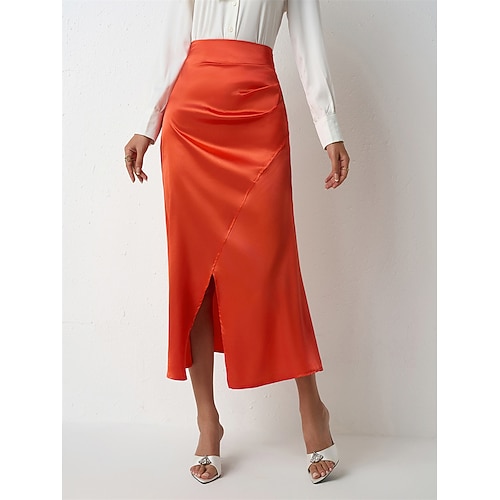 Per donna Gonna Elegante Moda Casual Midi Vita media Gonne Semplice Arricciato Con Spacco Micro-elastico Quotidiano Streetwear Nero Arancione Verde Beige Estate Poliestere