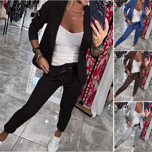Women Two Pieces Elegant Slim Fit Jacket Formal Office Work Pant Lapel Coat Set cm grey