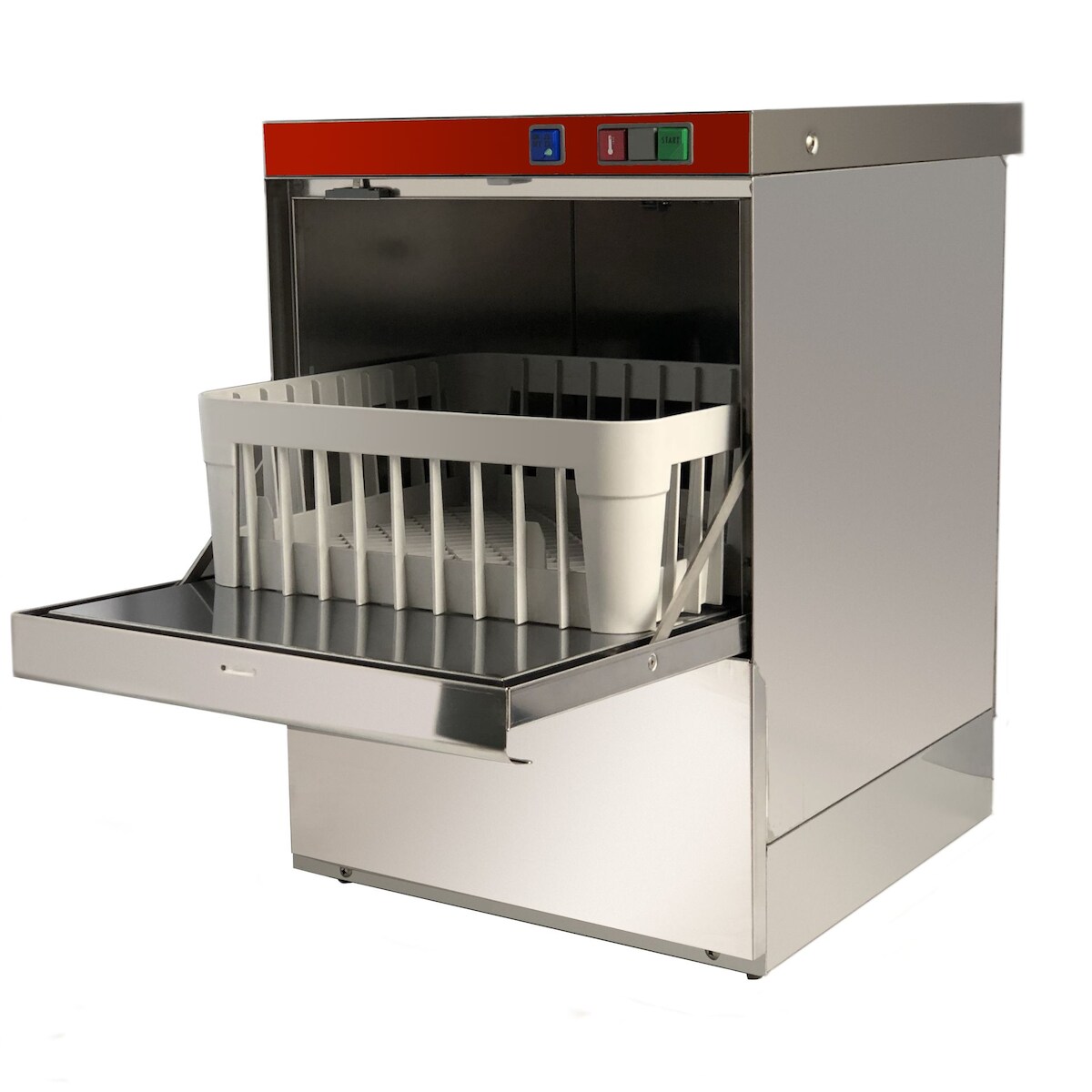Silver40-PS Gläserspülmaschine mit quadratischem Korb, 40 cm. Klarspülerspender und Abflusspumpe. Nutzbare Türhöhe: 28 cm. (BxTxH) 45x52x69,2 cm.