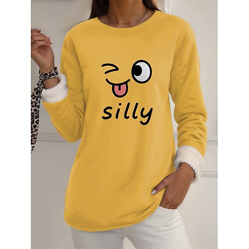 Felpa con fodera in pile da donna, pigiama, sì, ho freddo, lettera, streetwear, casual, manica lunga, girocollo, regular, per le feste, per uscire, stampa, nero, rosso, arancione, verde, grigio scuro