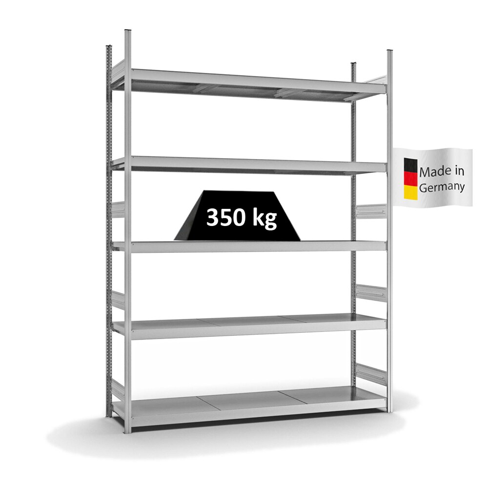PROREGAL Weitspannregal Stecksystem T-Profil | HxBxT 250x250x60cm | 4 Ebenen | Stahlplatten-Fachboden | Fachlast 350kg | Verzinkt | Lagerregal