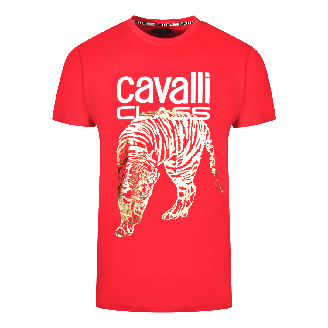 Cavalli Class Mens Large Gold Tiger Stencil Logo Red T-shirt Cotton - Size Large | Cavalli Class Sale | Discount Designer Brands